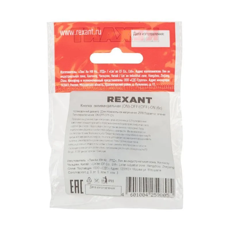Кнопка антивандальная Ø22 250В Фикс (6с) ON-OFF/OFF-ON подсв/зеленая REXANT (в упак. 1 шт.)