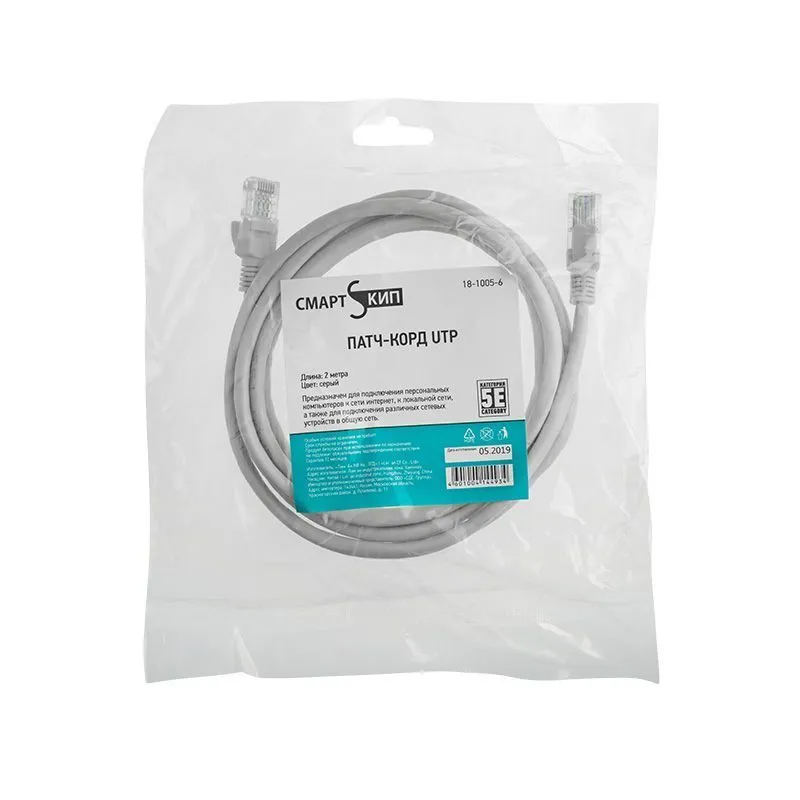СМАРТКИП Пaтч-корд U/UTP, категория 5e, RJ45-RJ45, неэкранированный, омедненный (CCA), PVC серый, 2м