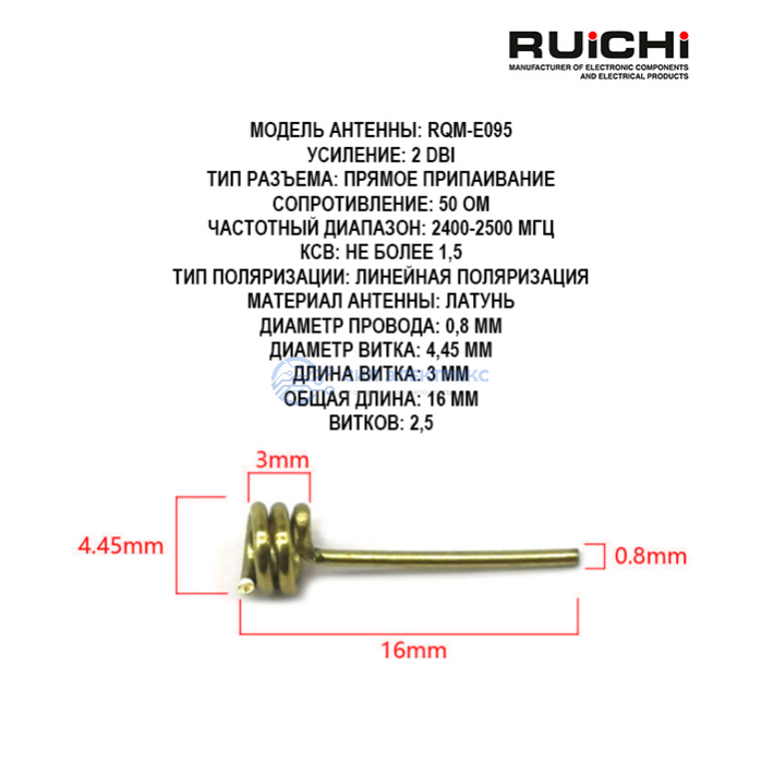 Мини антенна RUICHI RANT 2400-04 SMA-M, 2.4GHz, 2dBi, WiFi/Bluetooth/ZigBee, 2400- 2500MHz