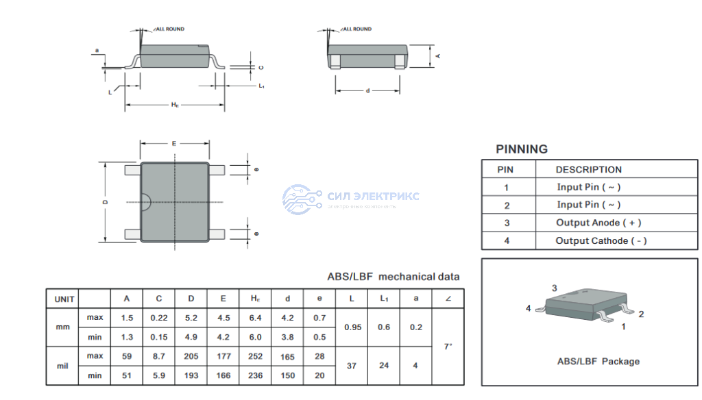 Диодный мост ABS10 рассчитан на ток до 1 А и напряжение до 1000 В. Компактный корпус ABS делает его идеальным для установки в схемы с ограниченным пространством. Мост обладает высокой устойчивостью к скачкам напряжения и стабильностью работы.