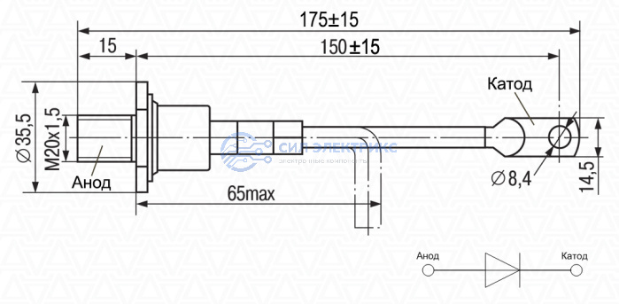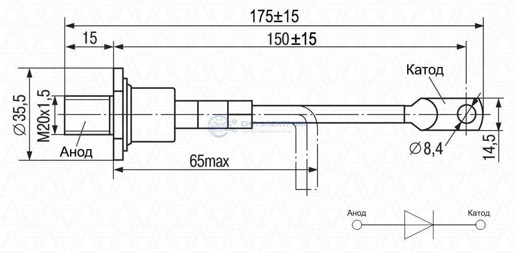 Силовой диод ВЛ50-10, 50А, 1000В, корпус цилиндрический