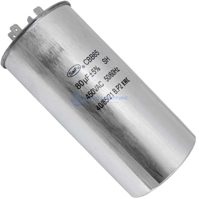 Пусковой конденсатор CBB65, 80 мкФ, 450 В, стандартное исполнение, бренд SAIFU, идеально подходит для работы в электродвигателях повышенной мощности. Устойчив к механическим и электрическим нагрузкам.