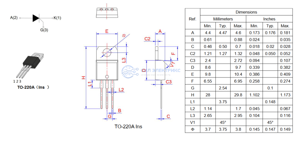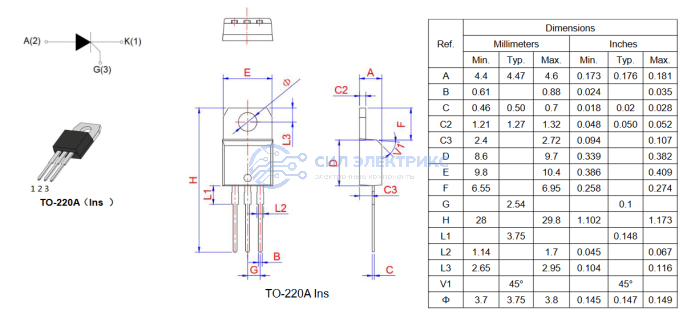 Низковольтный тиристор TYN812RG, 1200 В, 8 А, корпус TO-220