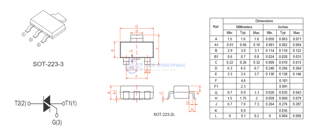 Симистор BT134W-600D, 600 В, 4 А, корпус SOT-223