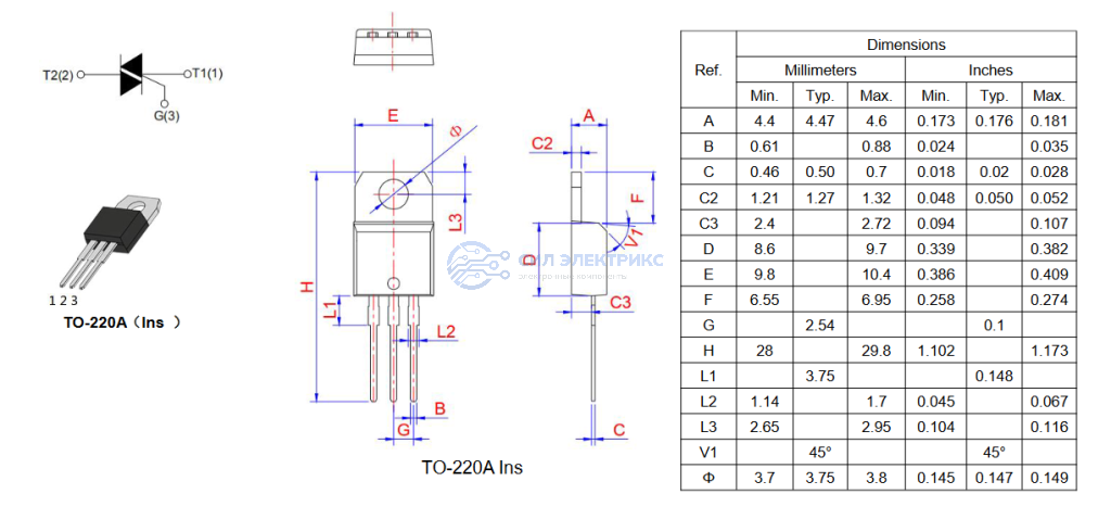 Симистор BTA06-800SW, 800 В, 6 А, корпус TO-220AB, изолированный