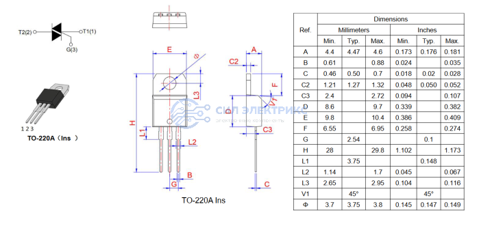 Симистор BTA06-600SW, 600 В, 6 А, корпус TO-220AB, изолированный
