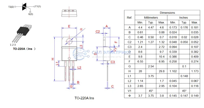 Симистор T1635-800E, 800 В, 16 А, корпус TO-220