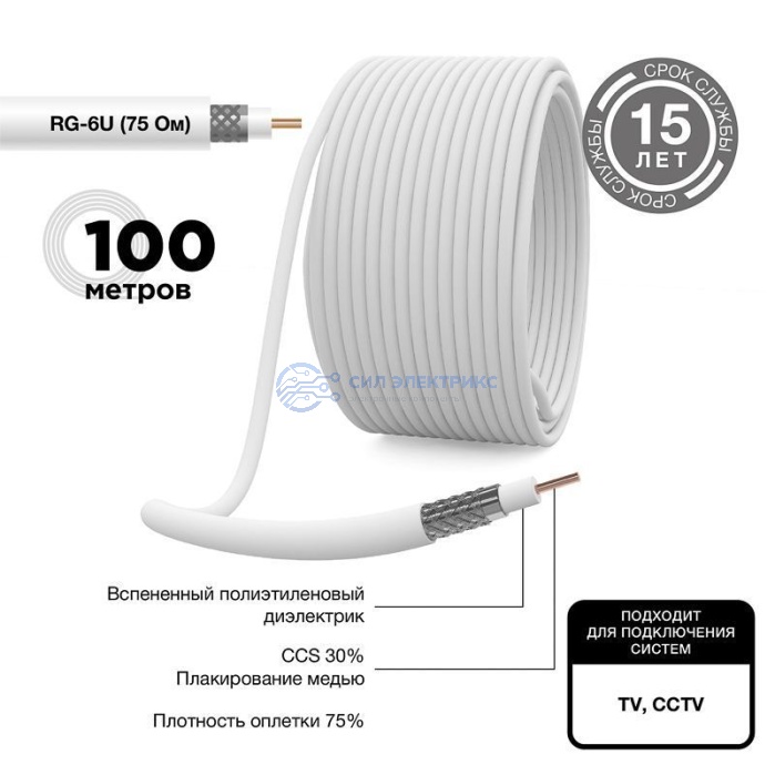 Кабель RG-6U (75 Ом), CCS/Al/Al 48%, бухта длиной 100 м, PROconnect коаксиальный радиочастотный (антенный, телевизионный) со вспененной полиэтиленовой изоляцией в ПВХ-оболочке. Является самым распространенным решением для подключения внутренних и межблочных соединений общепромышленных и бытовых радиотехнических устройств, для подключения систем телевидения, а также для подключения видеокамер наружного и внутреннего наблюдения.