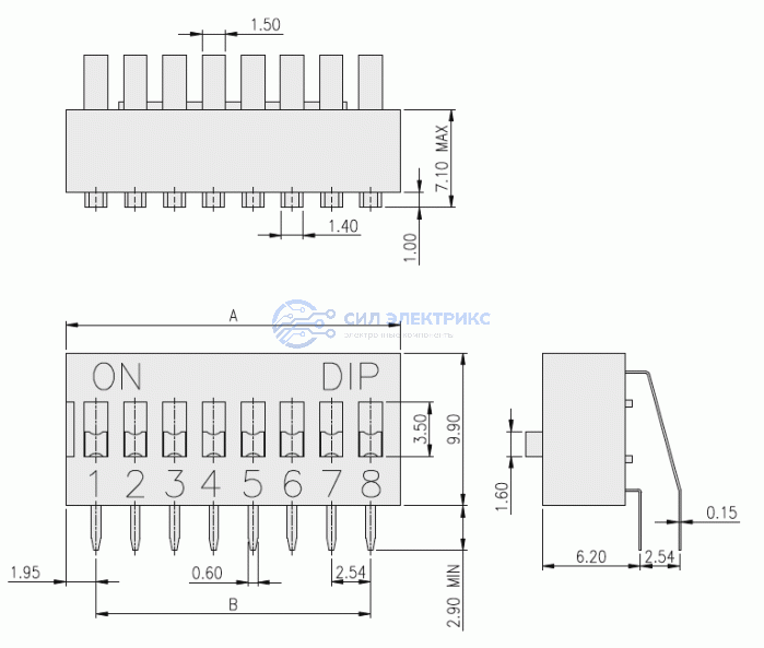 Переключатель DIP DA08R, 8 переключателей, стандартный, пластиковый корпус, 2.54 мм шаг