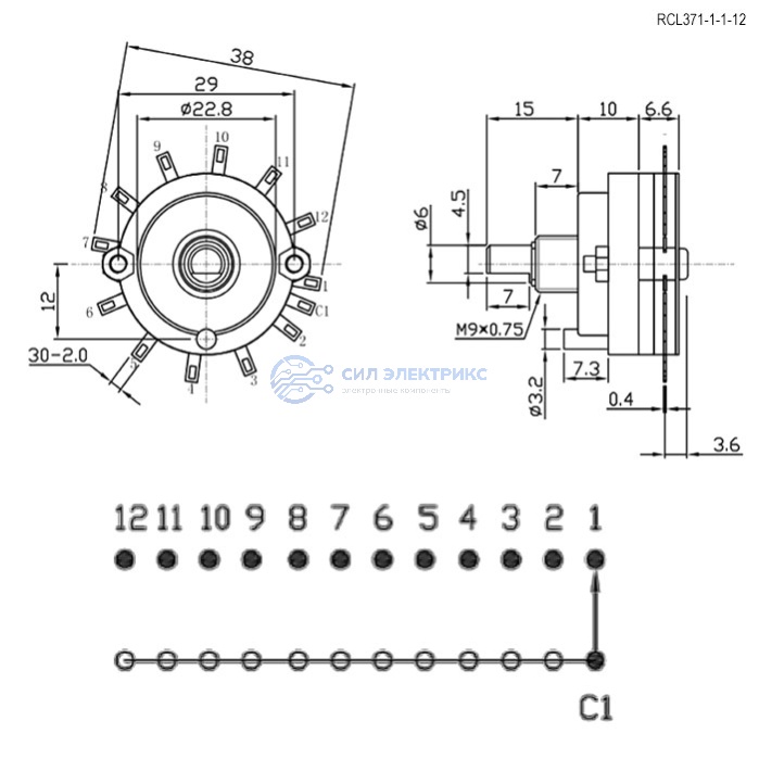 Галетный переключатель RCL371-1-1-12, 12 позиций, номинальное напряжение 250 В, ток 10 А