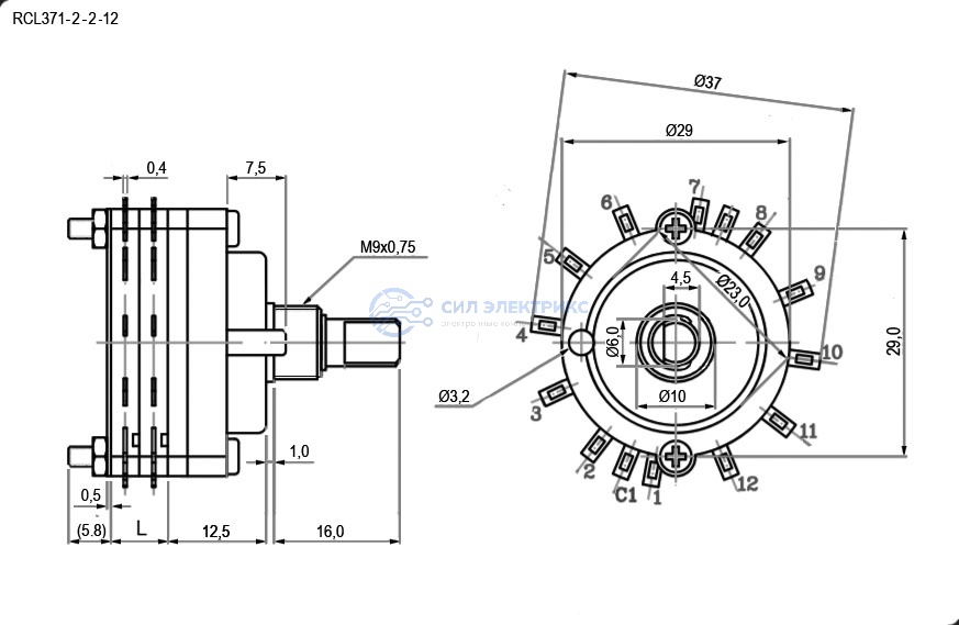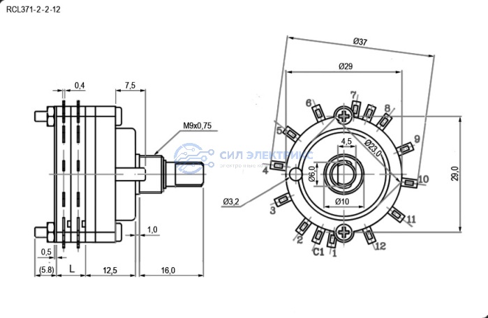 Галетный переключатель RCL371-2-2-12, 12 позиций, номинальное напряжение 250 В, ток 10 А