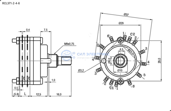 Галетный переключатель RCL371-2-4-6, 6 позиций, номинальное напряжение 250 В, ток 10 А