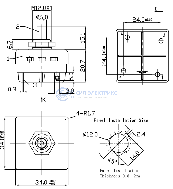 Переключатель RT-18-4P On-Off, номинальное напряжение 250 В, ток 1/2 А