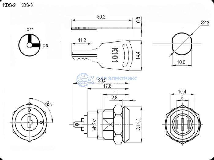 Ключ-выключатель KDS-2 on-off, 2 положения, с магнитной защитой, номинальное напряжение 250 В, ток 10 А