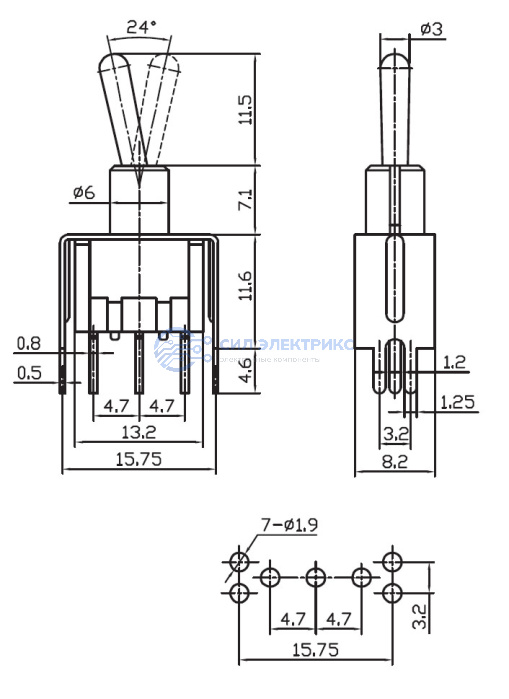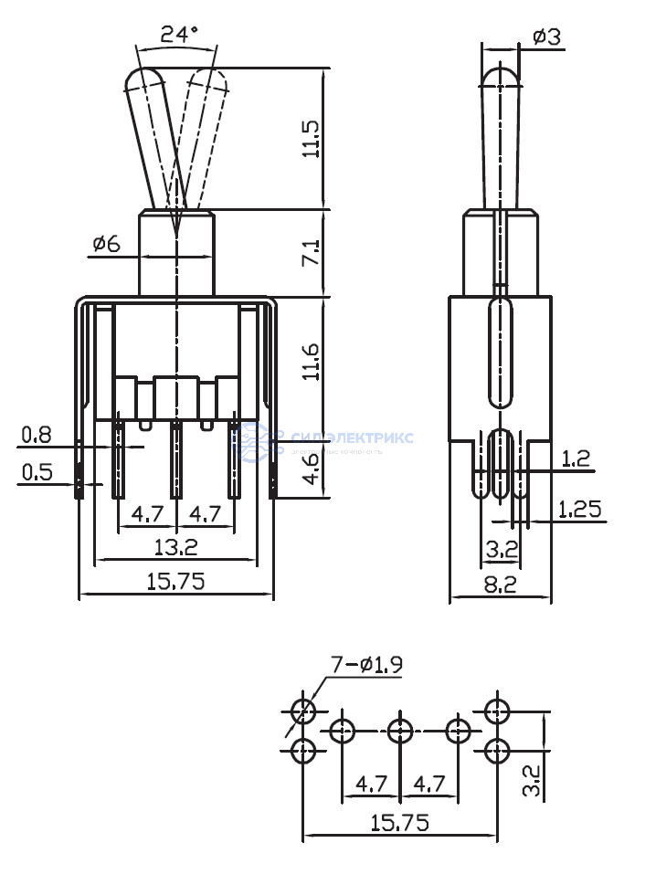 Микротумблер MTS-203-E1, ON-OFF-ON (краткосрочный колпачок), DPDT, 3 А, 250 В, 20 мОм