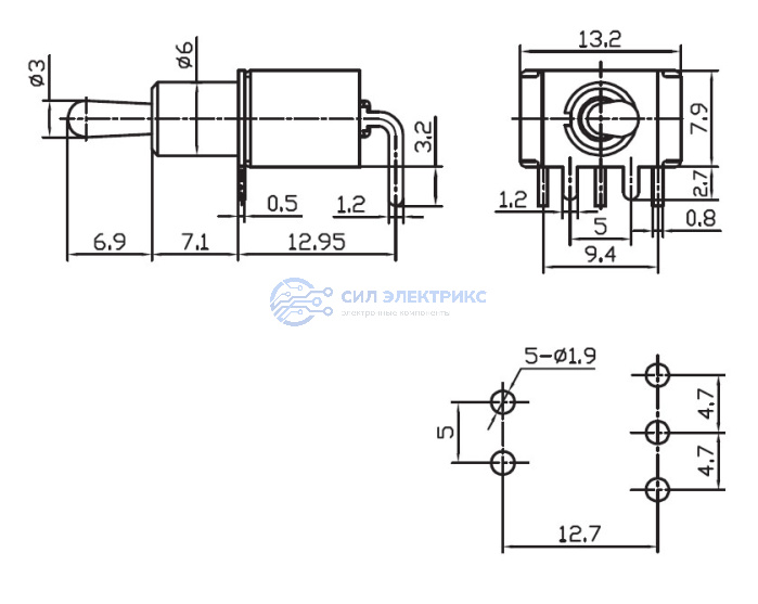 Микротумблер MTS-203-E1, ON-OFF-ON (краткосрочный колпачок), DPDT, 3 А, 250 В, 20 мОм