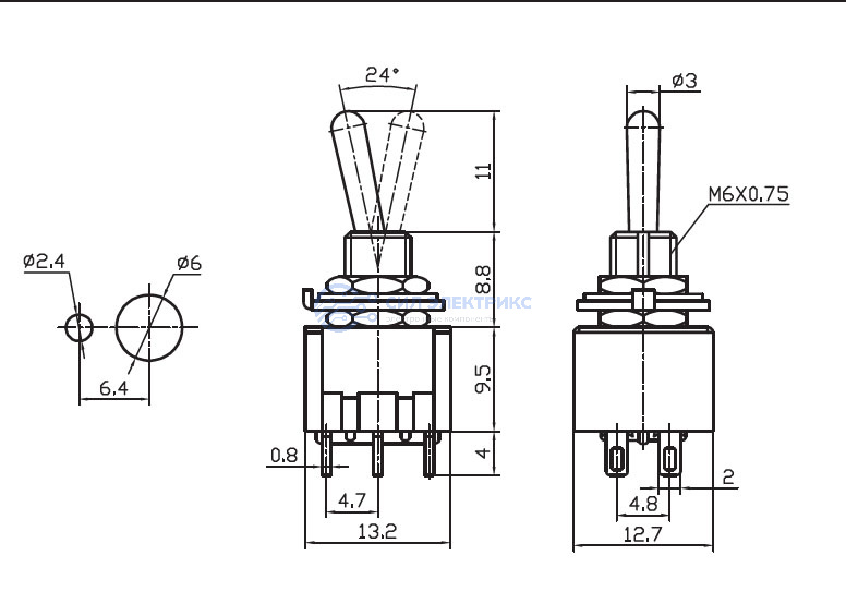 Микротумблер MTS-203-E1, ON-OFF-ON (краткосрочный колпачок), DPDT, 3 А, 250 В, 20 мОм