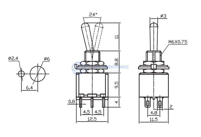 Микротумблер MTS-203-E1, ON-OFF-ON (краткосрочный колпачок), DPDT, 3 А, 250 В, 20 мОм