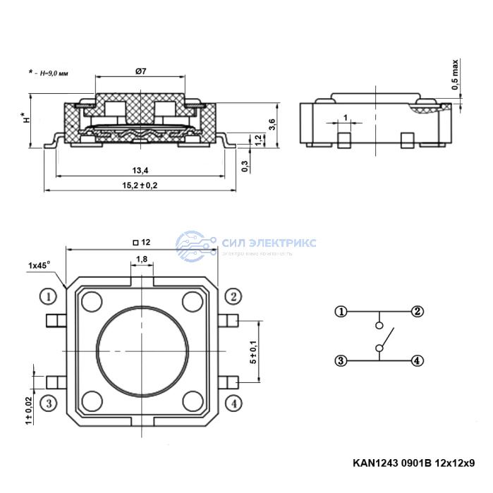 Тактовая кнопка KAN1211-1801B 12x12x18 mm
