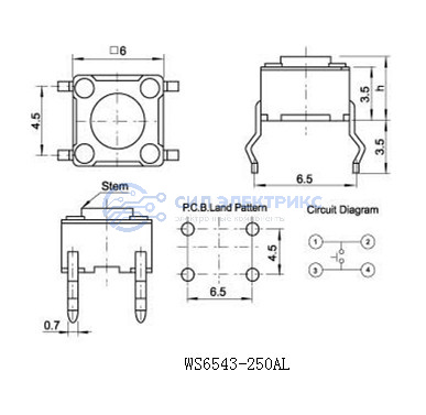 Тактовая кнопка WS6543-250AL, 8х8х4 мм, OFF-ON (4P), IP67, 250 мА, 12 В, 100 мОм