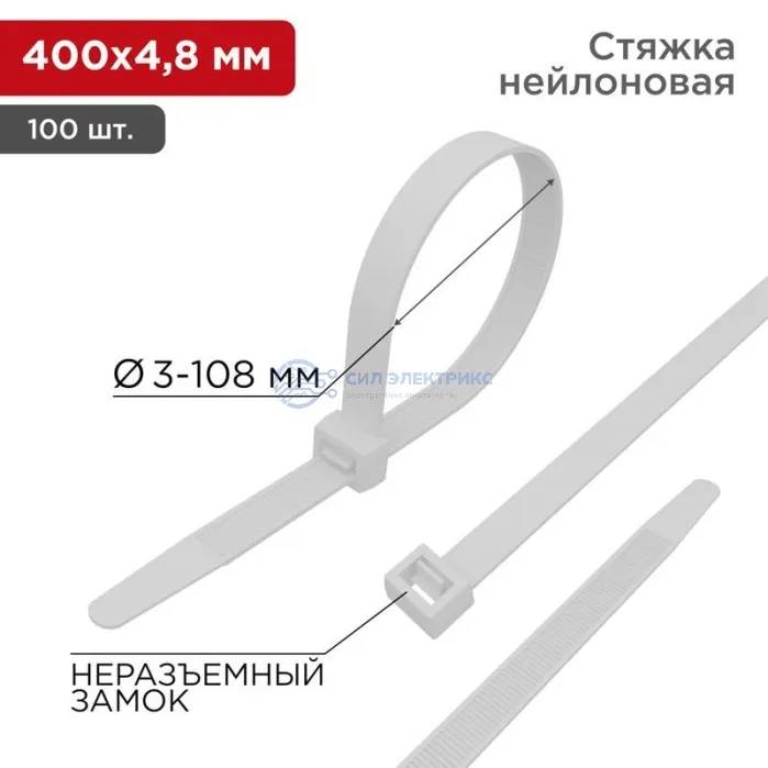 Хомут-стяжка кабельная нейлоновая 400x4,8мм, белая (100 шт/уп) REXANT