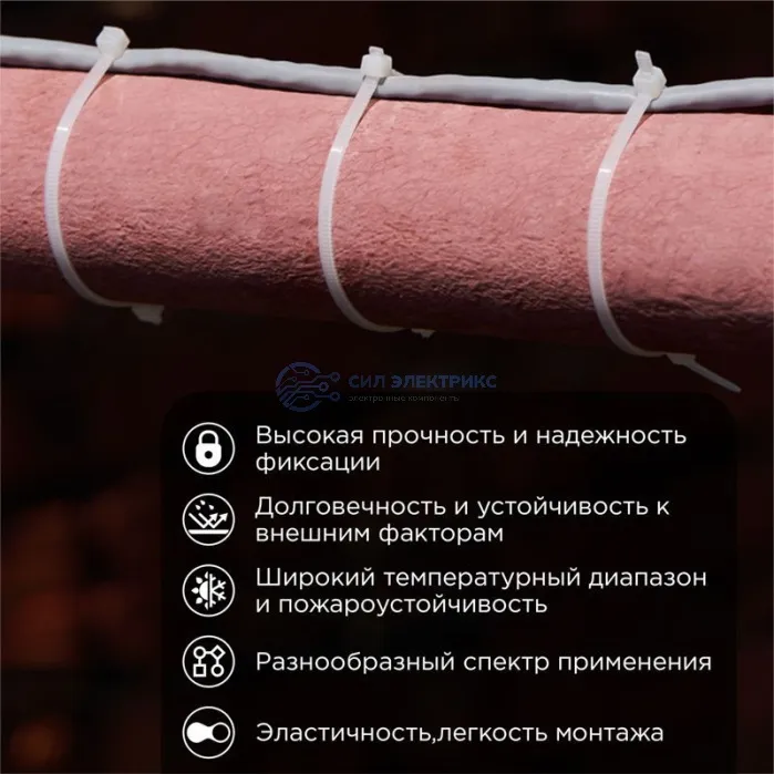 Отличительные свойства нейлоновых хомутов: высокая прочность на разрыв, пластичность, долгий срок службы, устойчивость к внешним факторам.